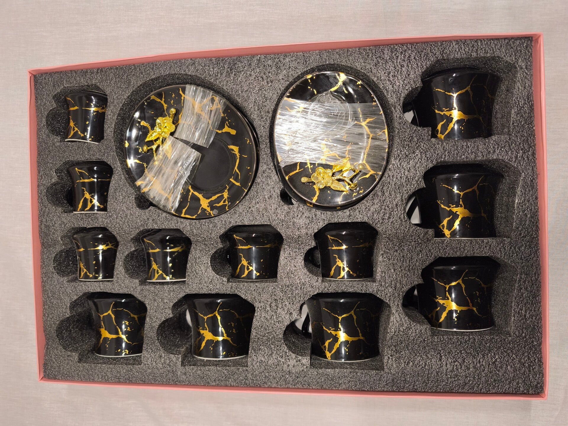 Verwöhnen Sie sich und Ihre Gäste mit dem exquisiten 24-teiligen Espressotassenset von Neudorf, ideal für jeden Anlass. Das Set besteht aus zwölf festlich geschmückten Tassen sowie Untertassen, die mit ihrer türkischen Eleganz und dem runden Mokka-Design nicht nur optisch begeistern, sondern auch mit einer Kapazität von 90 ml perfekt für den Genuss eines wahren Espressoerlebnisses sind. Gefertigt aus hochwertigem Porzellan und in traditioneller Töpferkunst hergestellt, verbindet dieses schwarze Set Funktionalität mit kunstvoller Handwerkskunst. Ob für den täglichen Gebrauch oder besondere Momente – dieses zwölfteilige Ensemble bereichert jede Kaffeetafel und macht den Genuss eines guten Kaffees zu einem echten Erlebnis.
